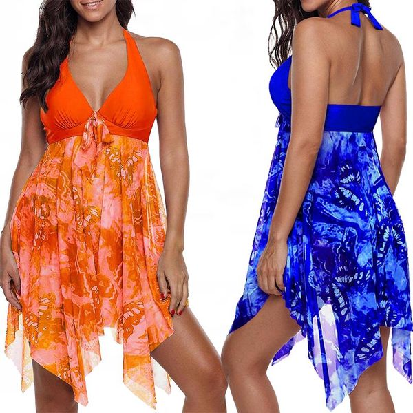 women summer irregular padded swimdress print halter swimming swimwear two piece plus size beach bathing swimsuit female tankini