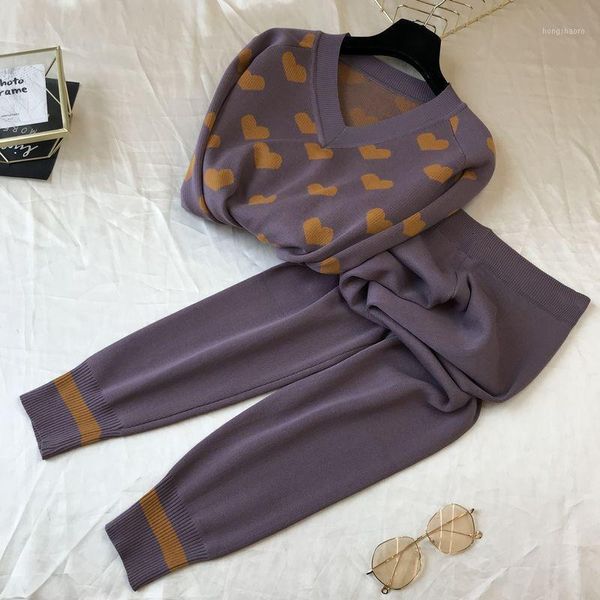 women sweatsuits sets love heart printing pullover sweaters+pants suit femme fashion jumpers trousers 2 pcs costumes outfit1, Gray