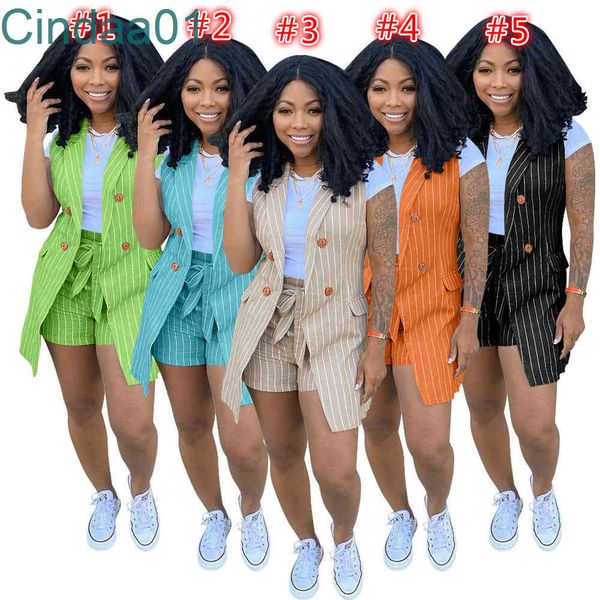 women tracksuits two pieces set designer outfits casual office clothes striped printed blazer waistcoat with belt shorts sportwear plus size, Gray