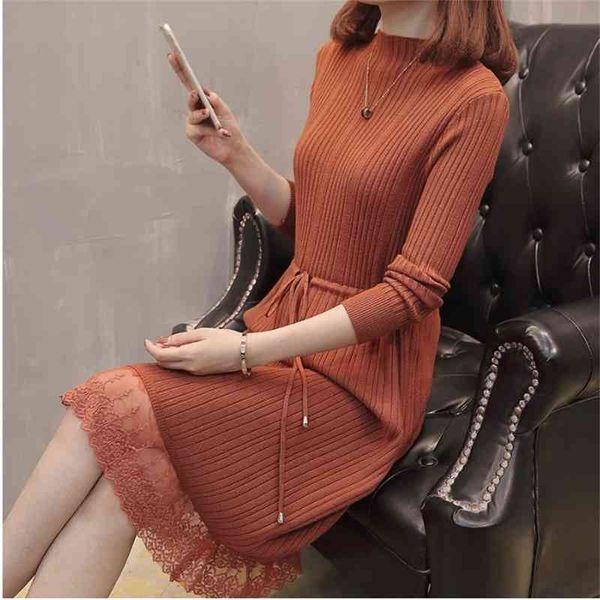 women warm sweater dress autumn winter elastic soild long sleeve a-line knitting dress female patchwork lace knitted 210514, Black;gray