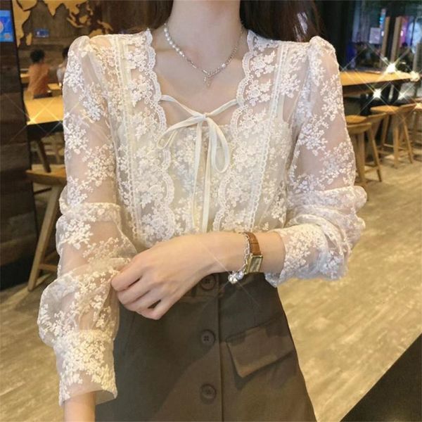 womens blouses shirts autumn blouse longsleeved embroidery lace chiffon shirt bow tie blusas mujer de moda femme 230302, White