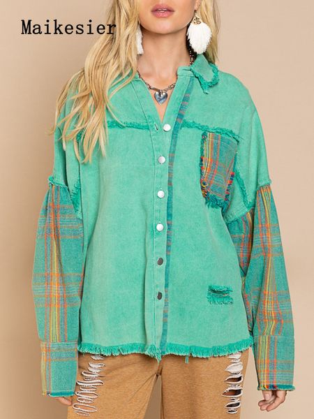 womens jackets women denim jacket autumn fashion plaid stitching loose green jean office lady streetwear casual outerwear 230301, Black;brown