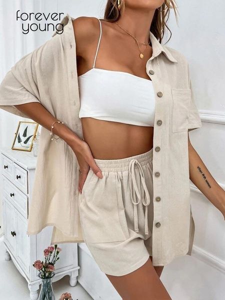 womens two piece pants cotton casual summer tracksuit solid female sets turndown collar short sleeve shirt and loose mini shorts suits 2302, White