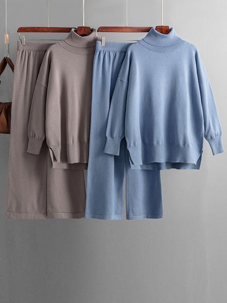 womens two piece pants elegant knitted set chic warm solid turtleneck pullover autumn winter leisurefemale sweater trouser suits 230818, White