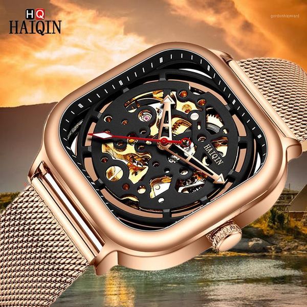 wristwatches 2021 haiqin automatic hollow men's watch brand waterproof military clock simple men mechanical watches relogio masculino, Slivery;brown