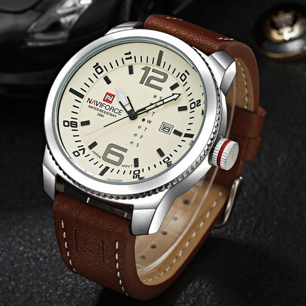 wristwatches 2021 naviforce date quartz watch men casual military sports watches leather wristwatch male relogio masculino cloc, Slivery;brown