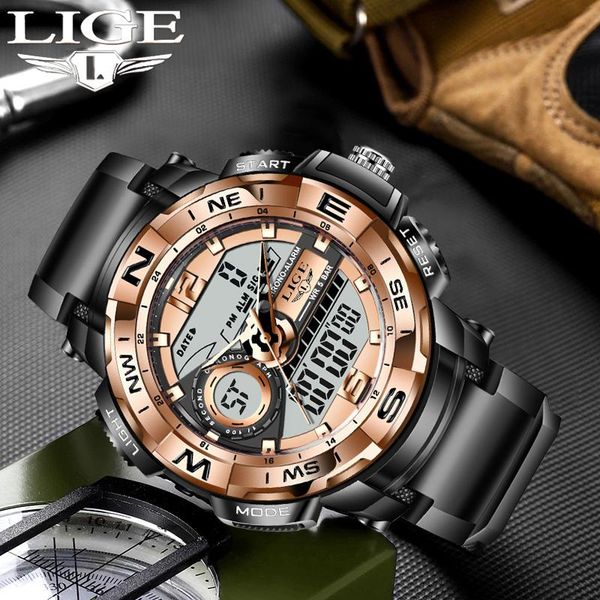 wristwatches lige watches men military army mens watch waterproof sport wristwatch dual display male relogio masculino, Slivery;brown