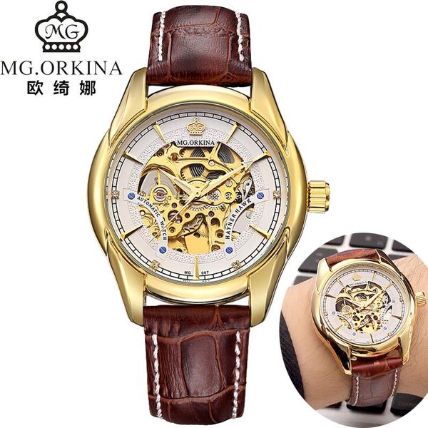 wristwatches mg.orkina montre homme automatic watch men gold skeleton mechanical wrist watches mens transparent clock for man, Slivery;brown