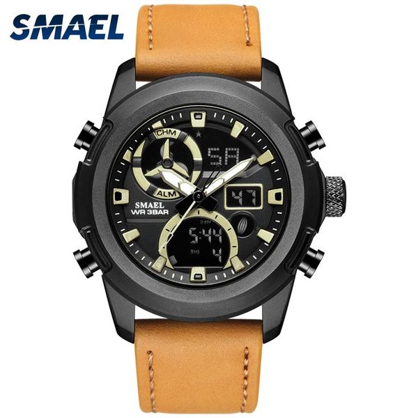 wristwatches watches mens 2021 waterproof military sport quartz watch for men luxury leather strap 2 time led digital male, Slivery;brown