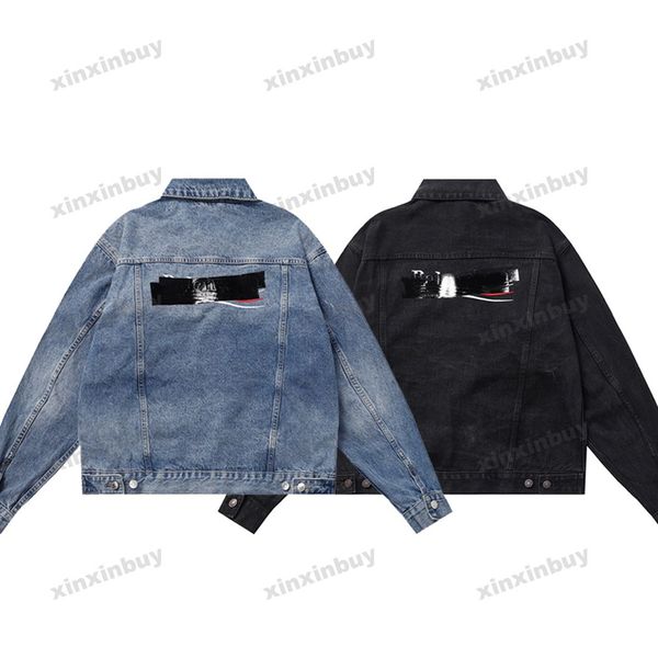 xinxinbuy men designer coat jacket sea wave embroidery denim long sleeve women black khaki blue xs-2xl, Black;brown