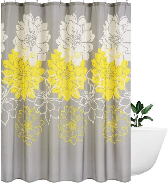 yellow shower curtain for bathroom, peony flower fabric shower bath curtain for shower, bathtub, yellow and grey,
