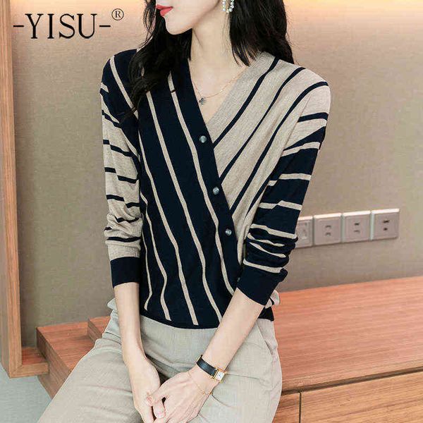 yisu autumn women sweater v-neck casual jumper long sleeve stripes stitching color knitted pullover fashion women's clothing, Black
