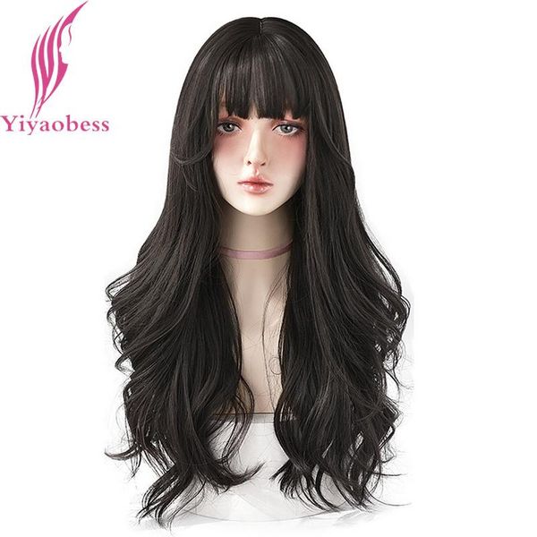 yiyaobess 26inch long brown wig with bangs synthetic natural hair daily life black wigs for women perruque