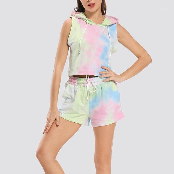 yoga outfits luobolan tie dye crop sweater+leisure shorts gym sport sets women cotton sleeveless hooded fitness workout vest+shorts 2pcs/set, White;red