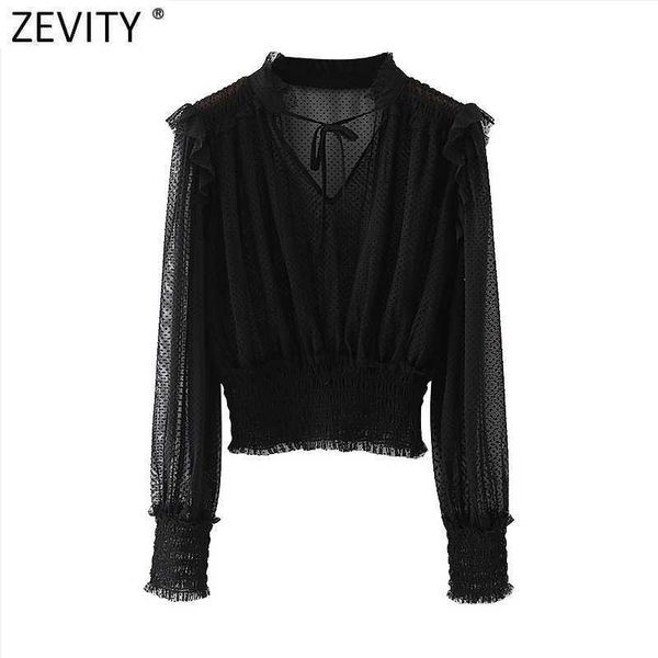 zevity spring women perspective dots mesh blouse female v neck pleated ruffles puff sleeve shirt chic bow ls7561 210603, White